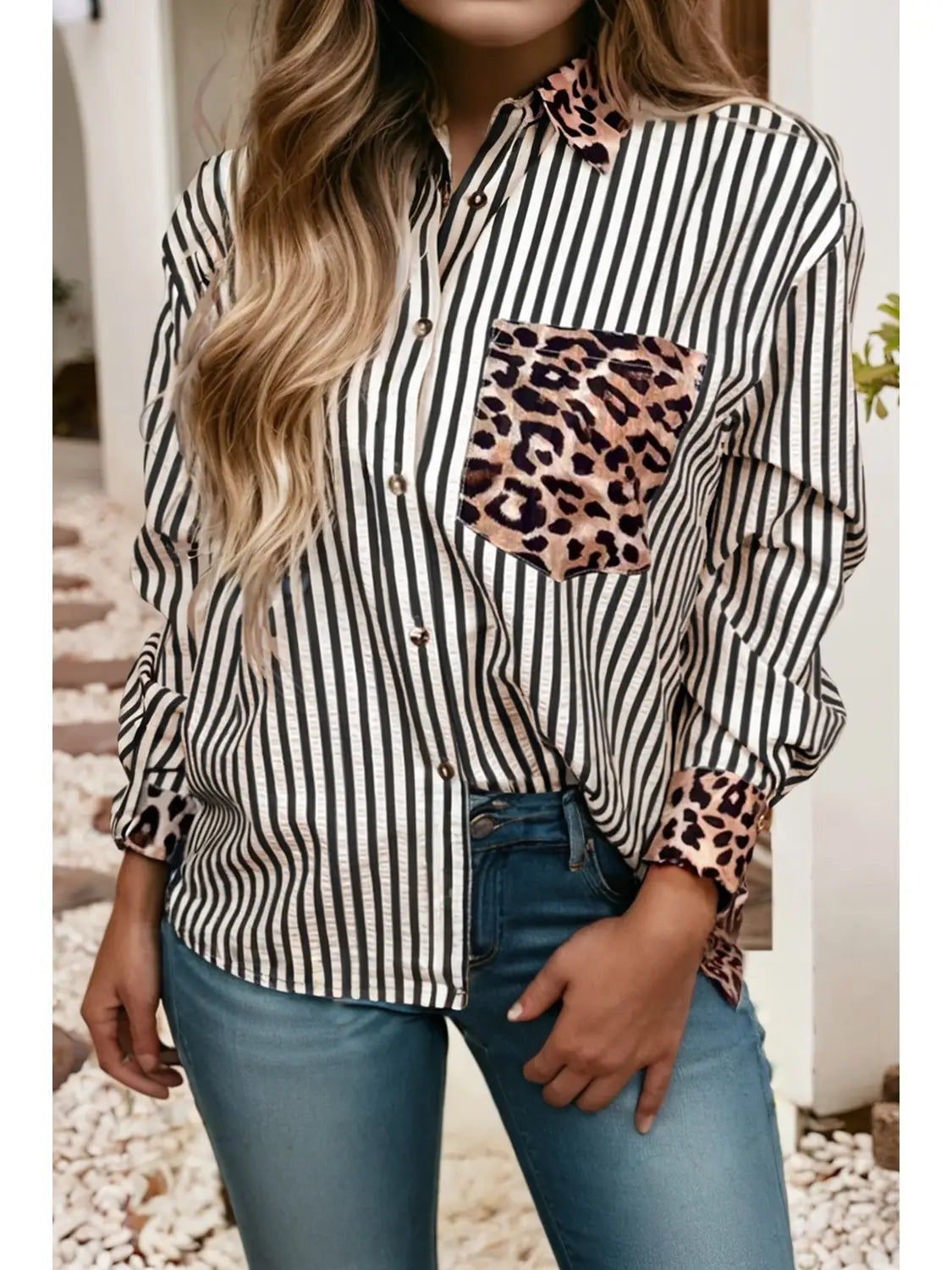 Black/Chic Contrast Leopard & Stripes Button Shirt