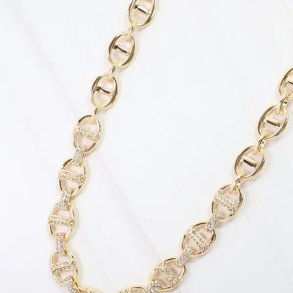 Add a touch of sparkle with the Norwich Pave Chain Necklace in Gold. Featuring shiny gold oval links accented with pave details on the front nine links, this necklace is perfect for layering or wearing solo to make a subtle yet stylish statement. Its gleaming design brings a fashionable and fun vibe to any outfit. Dimensions: * 16" Length * 3" Extender