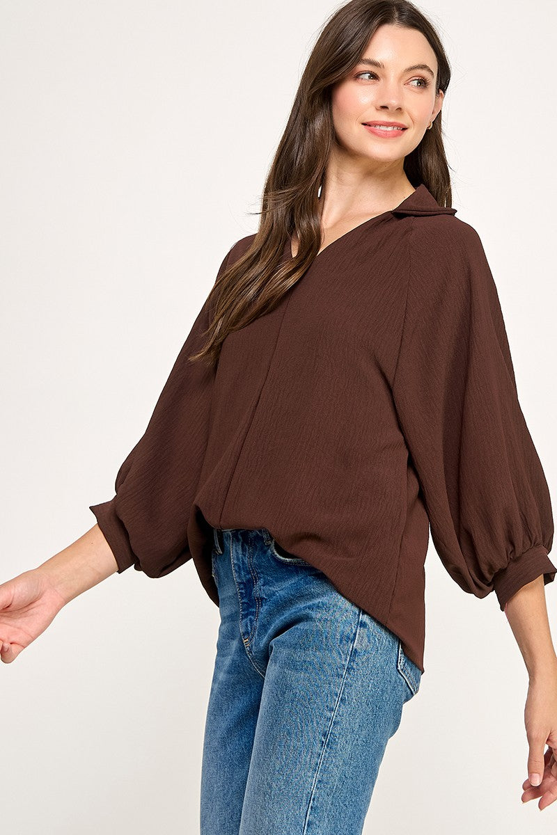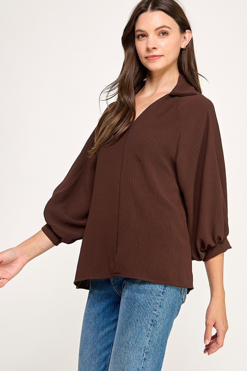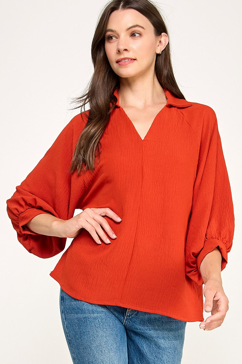 Solid collared blouse V neck Cuffed 3/4 voluminous sleeve Solid air flow fabric, slight stretch