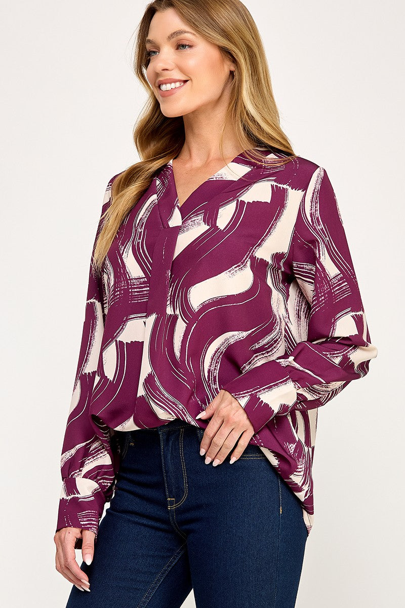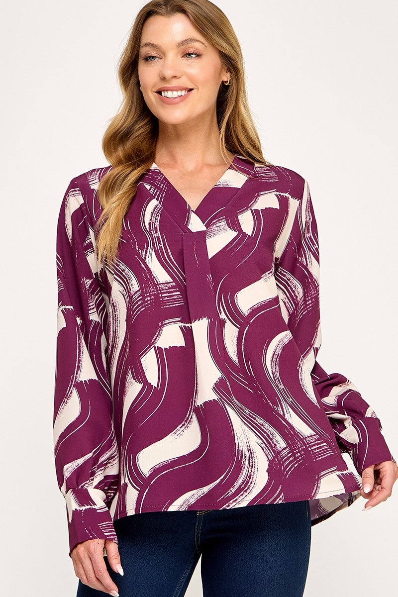 Wine-Print v-neck blouse Cuffed long sleeve Crossover v neckline detail Front box pleat detail Woven abstract brushstroke 2 tone print fabric-No stretch