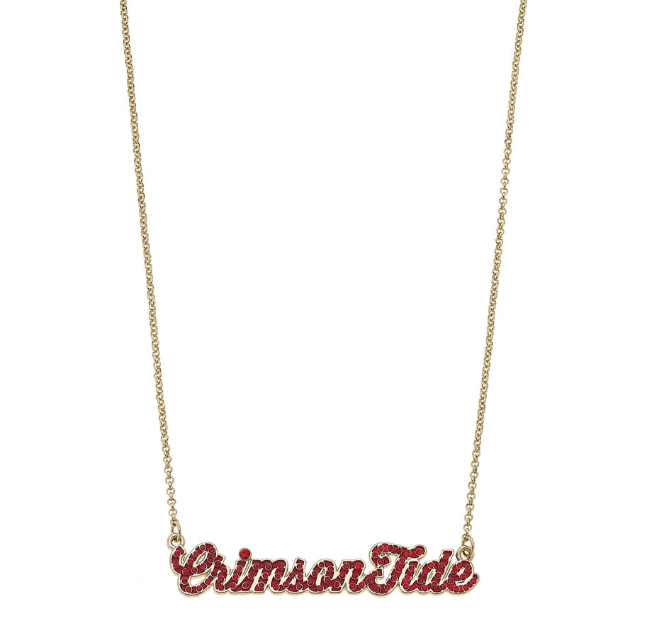 This Alabama Crimson Tide Pave Autograph Enamel Necklace is the perfect way to show off your team pride in style. The striking crimson enamel is beautifully complemented by pave detailing, offering a sophisticated touch for the ultimate fan accessory. DETAILS Base Metal with Shiny Gold Plating 16" Adjustable NCAA Officially Licensed