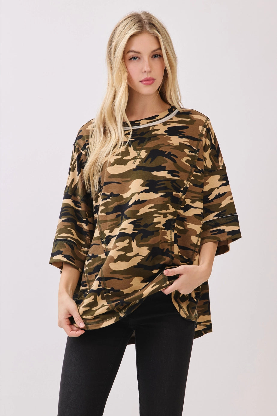 bold camo print meets effortless edge in this relaxed tee with contrast stitch detailing and a slouchy silhouette. Crafted for comfort with a boxy fit and soft fabrication, this top is perfect for casual days, outdoor hangs, or standout gameday style. Throw it on with denim shorts or joggers for an easy, cool-girl vibe.camo tee, camouflage top, gameday style, oversized tee, stitch detail top, relaxed fit shirt, weekend wear, sporty casual, tailgate outfit, edgy style, laid-back tee, short sleeve top, comfy top, casual camo, streetwear style, lounge top, fashion tee, cool girl style, everyday essential 94% POLYESTER, 6% SPANDEX