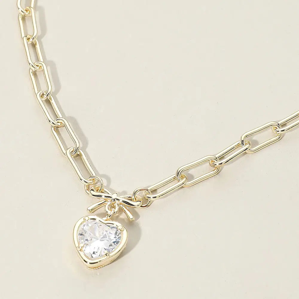 14K Gold Plated Bow Top Heart Cz Stone Bezel Pendant Necklace