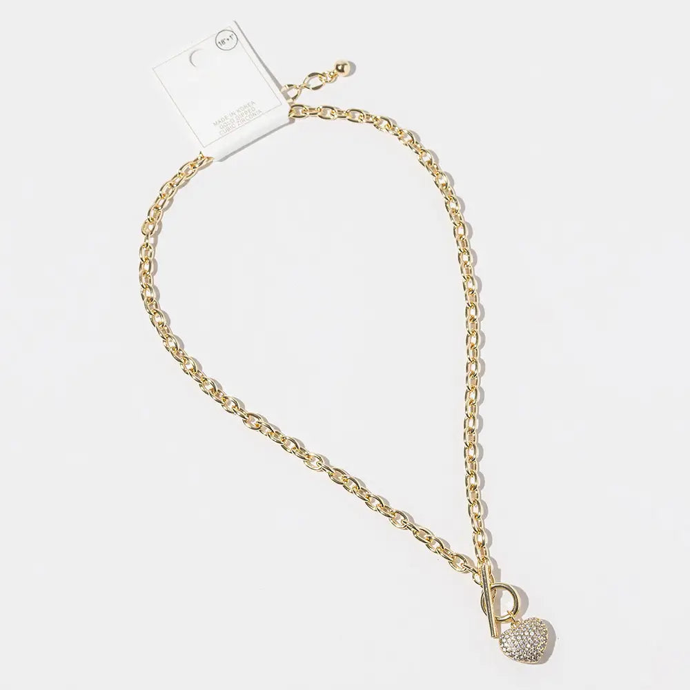 Gold Dipped Chunky Chain Cz Stone Paved Puff Heart Toggle Pendant Necklace