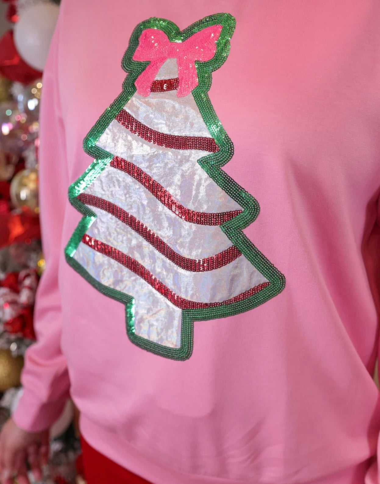 The Foil Bow Christmas Treat Luxe Pullover, made from our favorite luxe fabric, shines with a fun foil Christmas treat design topped with a cute pink bow. Soft and cozy, it’s just right for a casual and festive holiday vibe.